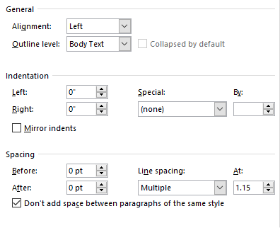 - Line Spacing- this should be 1.15. There should be a space between all new paragraphs